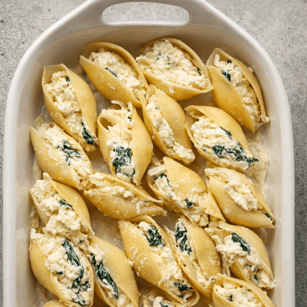 Take each cooked shell and gently fill it with the ricotta mixture using a spoon. Arrange the stuffed shells in the baking dish in a single layer.
