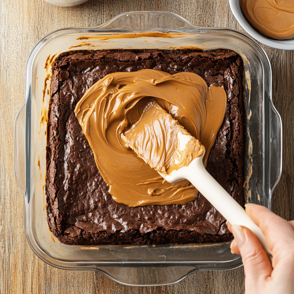 3. Spread the peanut butter mixture over the cooled brownies and pat it down evenly.