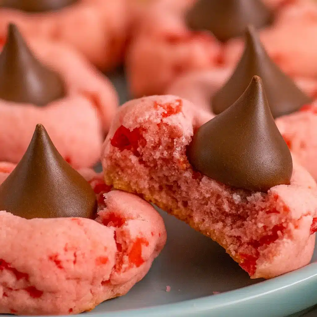 Soft buttery cookies flavored with maraschino cherries and topped with chocolate kisses. Perfect for holidays or gifting.