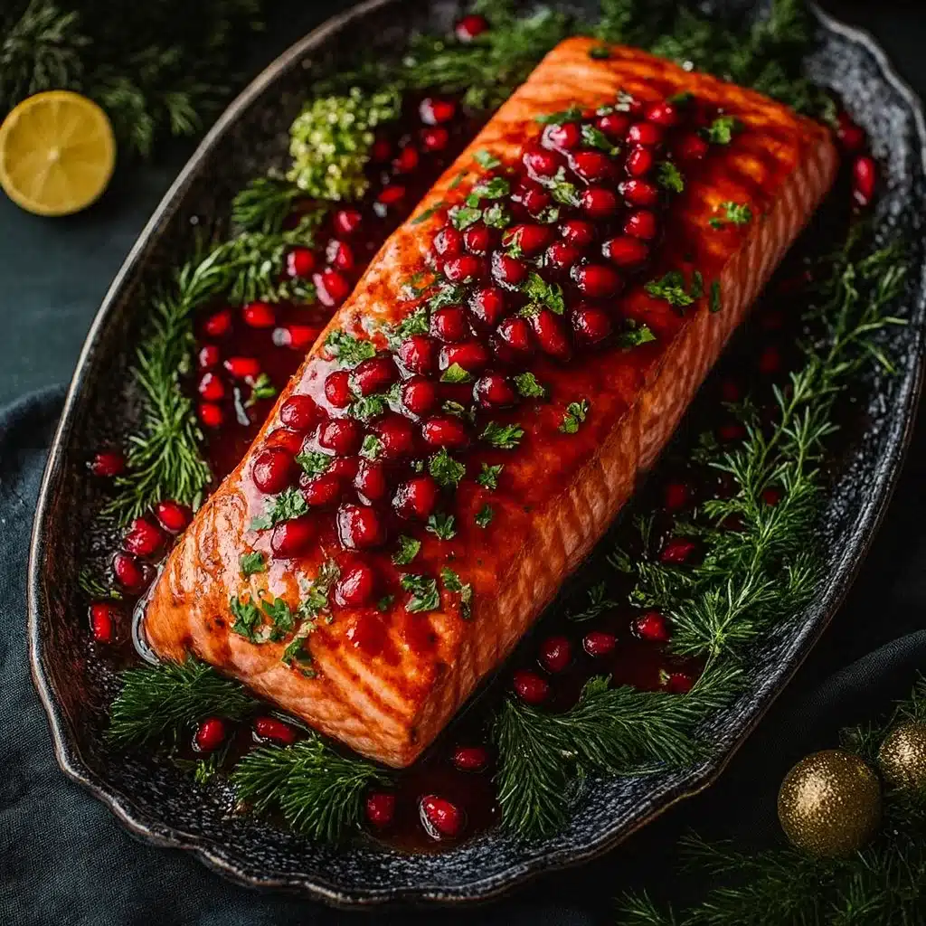 Festive baked salmon brushed with a sweet-tart pomegranate glaze, topped with fresh pomegranate seeds and herbs — perfect for Christmas dinner.
