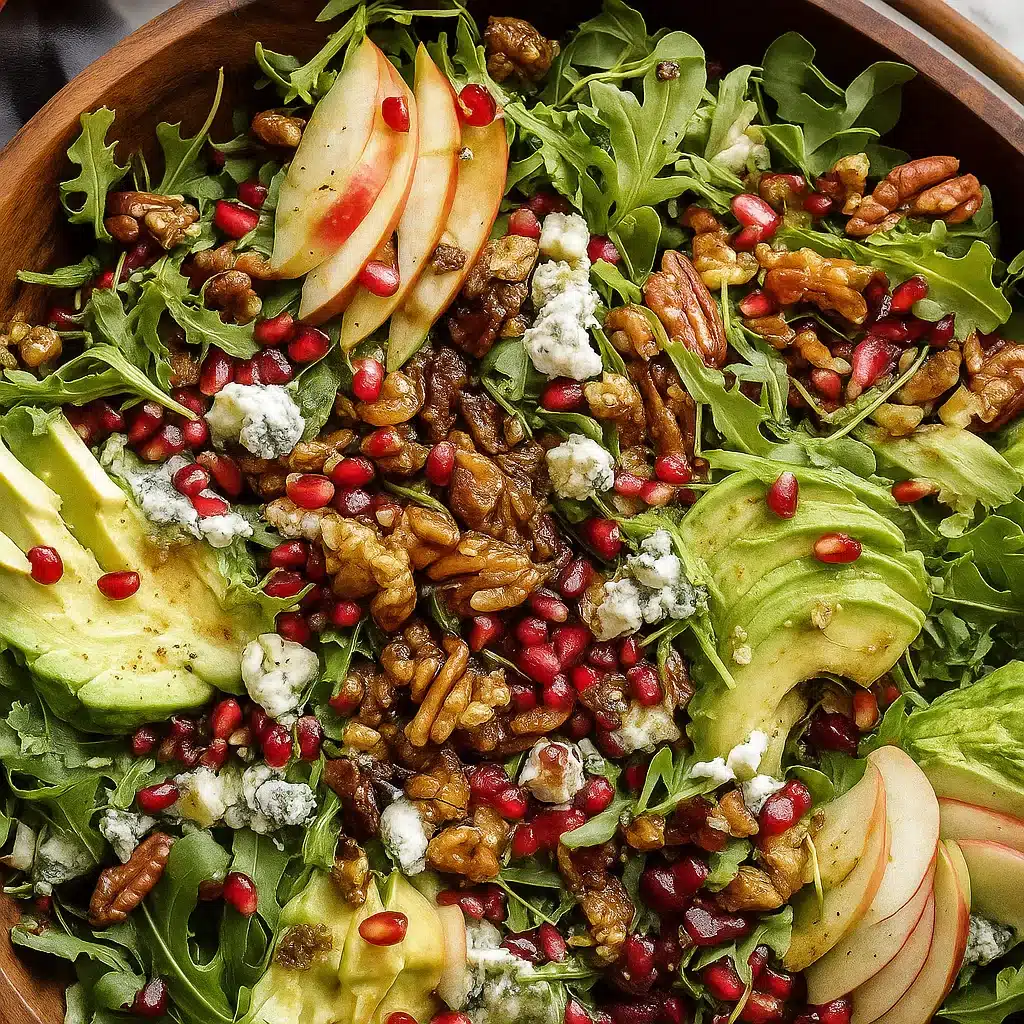 Scatter pomegranate arils evenly across the greens. Sprinkle crumbled feta cheese and chopped nuts over the top. The mix of textures—juicy, creamy, and crunchy—makes this salad irresistible.