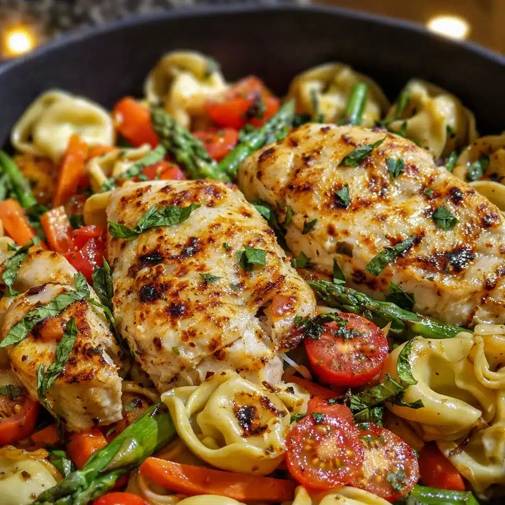 Add the cooked tortellini to the skillet with the chicken and vegetables. Pour in the remaining dressing and toss gently to coat everything evenly. Let it warm through for about 2 minutes.