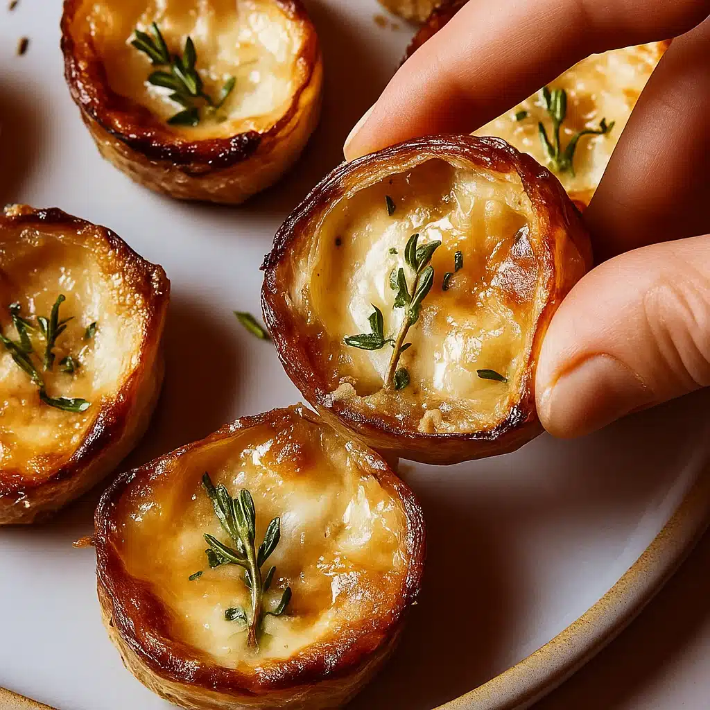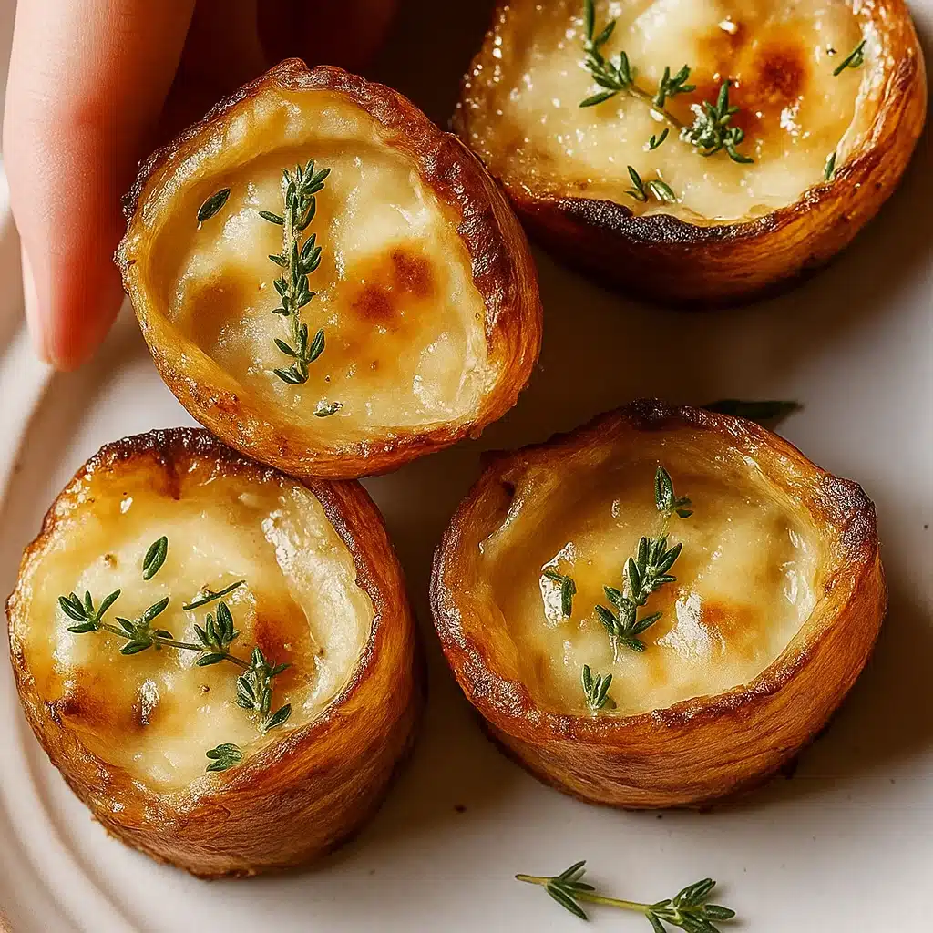 Mini pastry cups filled with caramelized onions, savory broth, and melted cheese — the perfect bite-sized version of French onion soup.