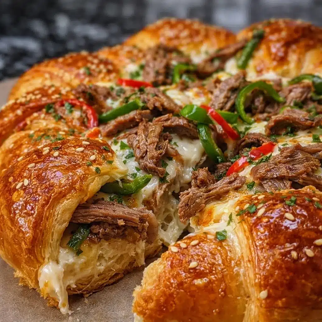 A flaky crescent ring filled with tender steak, onions, peppers, and provolone cheese — a fun twist on the classic Philly cheesesteak.